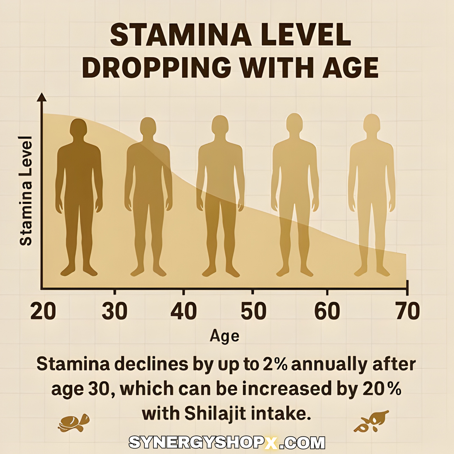 As you age, stamina gradually declines—dropping by up to 2% per year after 30. But aging doesn’t have to slow you down! Shilajit can enhance your stamina by 20%, keeping you energized, active, and unstoppable.